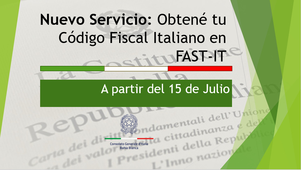 ¡Nuevo servicio disponible! Ahora podés obtener tu Código Fiscal italiano de manera rápida y sencilla a través de Fast It. Si sos ciudadano italiano inscripto en el AIRE en la Circunscripción consular del Consulado General de Italia en Bahía Blanca, ¡este servicio está diseñado para vos!