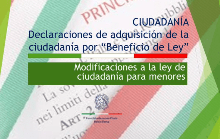 En particular, se señala el nuevo procedimiento para la adquisición de la Ciudadanía para los hijos menores nacidos en el exterior en los casos de aplicación de la normativa por «beneficio di legge» (más información en https://consbahiablanca.esteri.it/…/adquisicion-de-la…/) y en los otros casos en la sección “Nacimiento de un hijo (menor)” https://consbahiablanca.esteri.it/…/nacimiento-de-un…/ .