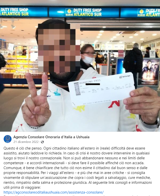 L’Agenzia Consolare Onoraria a Ushuaia è un ufficio consolare di II categoria – con circoscrizione di competenza la Terra del Fuoco argentina, che dipende dal Consolato Generale d’Italia a Bahia Blanca.