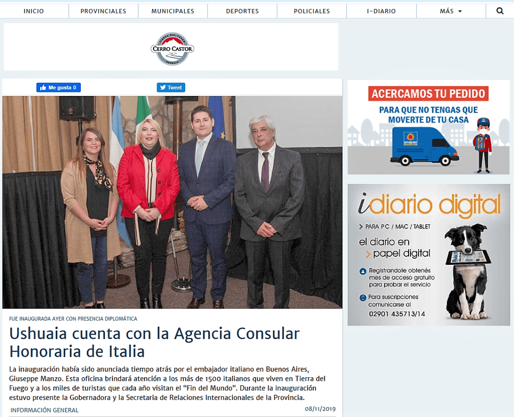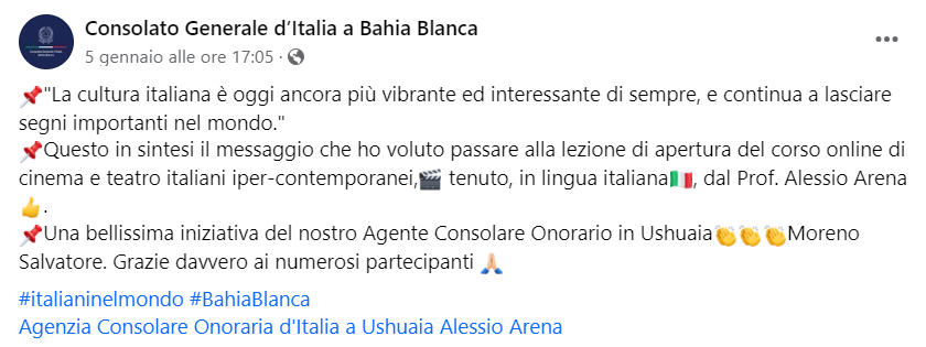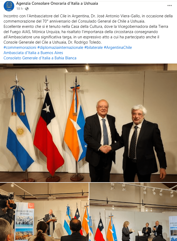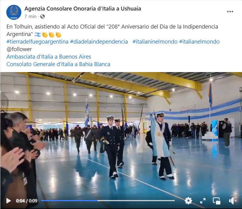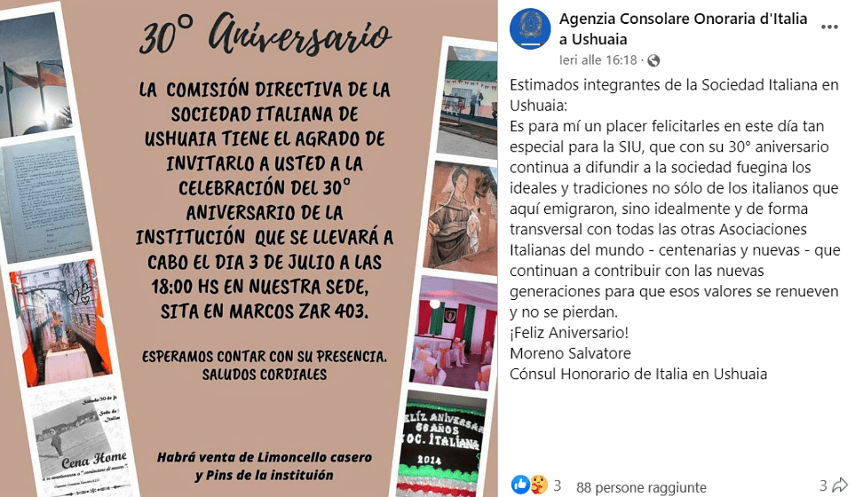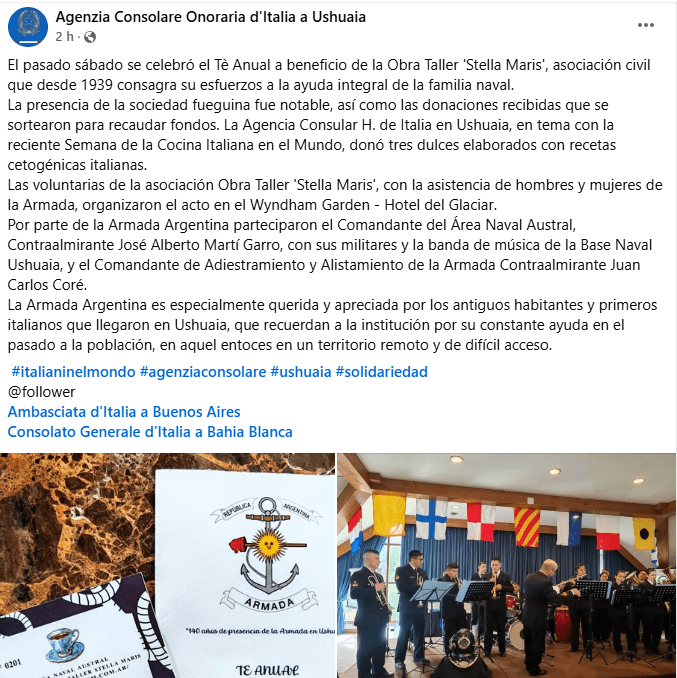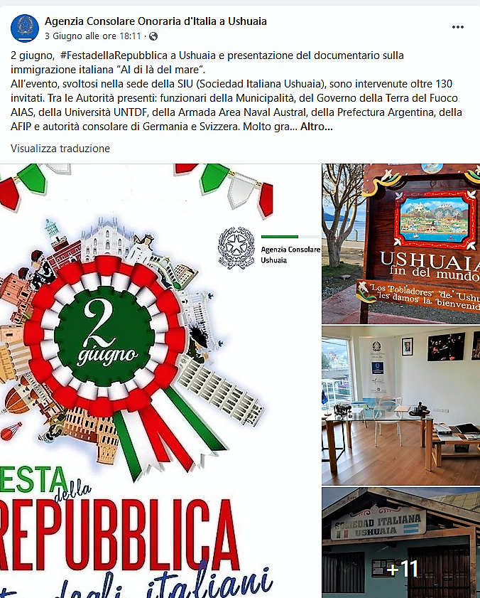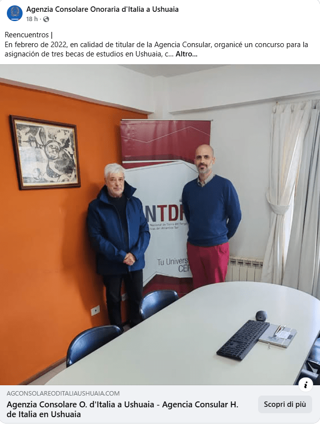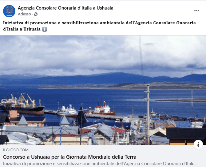 Facebook, link: https://www.facebook.com/agconsolareoditaliaushuaia/posts/pfbid0A1h7s3WyW8a5XzQHCPFKswdF1rxmVmoBhyWJbNTQfuvCzTRgh8sRuDy9tbDLatq8l