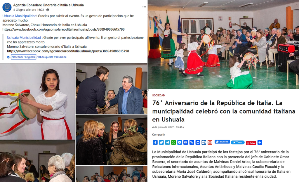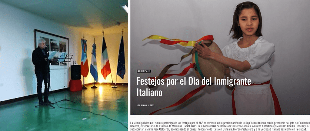 🔴 2 e 3 giugno 2022 a Ushuaia: Festa della Repubblica Italiana e Día del Inmigrante Italiano en Argentina. Alle due celebrazioni sono intervenuti oltre 230 invitati. La cronaca e le foto nei due link sotto indicati.