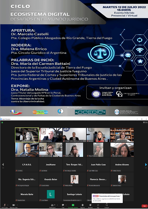 🔴 12 de Julio de 2022. Interesante webinar organizado por el “Circulo Giuridico di Argentina” y el Colegio Publico de Abogados de Rio Grande. Una conferencia con palabras de inicio de la Dra. María del Carmen Battaini (Directora de la Escuela judicial de Tierra del Fuego y Jueza del Tribunal Superior de Justicia Fuegino) y posteriormente la Dra. Natalia Molina (Jueza Titular del juzgado N°8 en lo Penal, C.y F. de la ciudad de Buenos Aires) que expuso el tema “Abordaje de la lucha contra la cibercriminalidad”. Un gradecimiento especial a la Dra. Malena Errico (Pta. del Circolo Giuridico di Argentina) por la amable y bienvenida invitación a participar.
