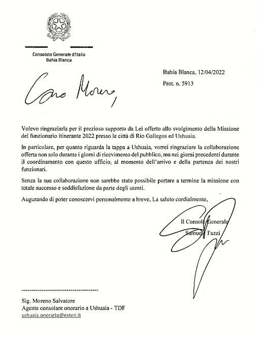 Grazie e buona visita! Nicola Bazzani – Console Generale d’Italia, Bahia Blanca.”