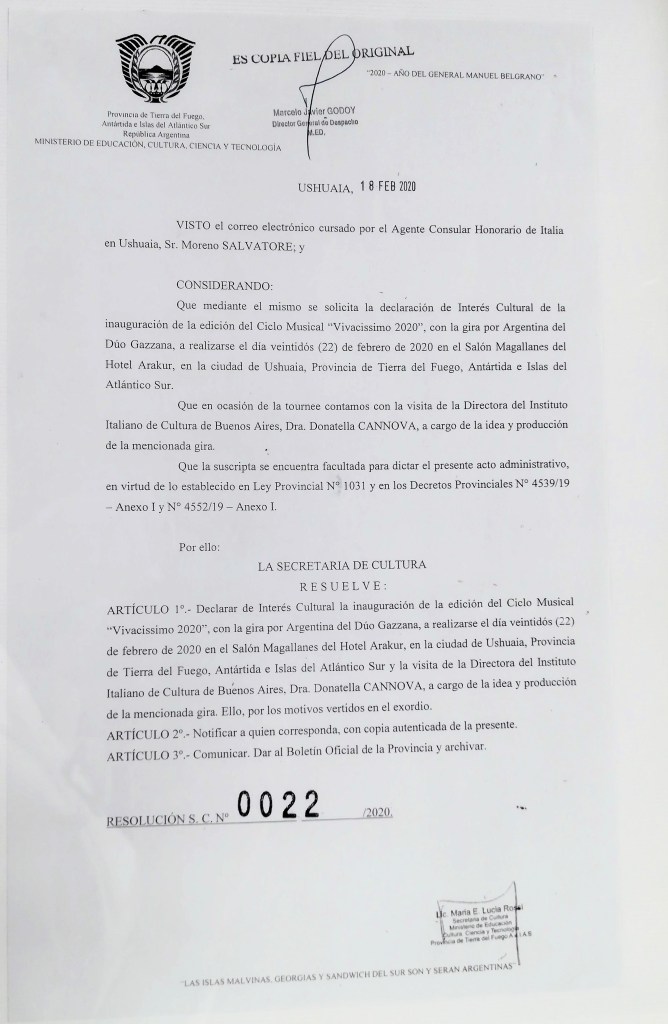 🔴 Concierto Duo Gazzana, Hotel Arakur, Ushuaia, organizado por Istituto Italiano di Cultura en colaboración con la Agenzia Consolare Onoraria a Ushuaia