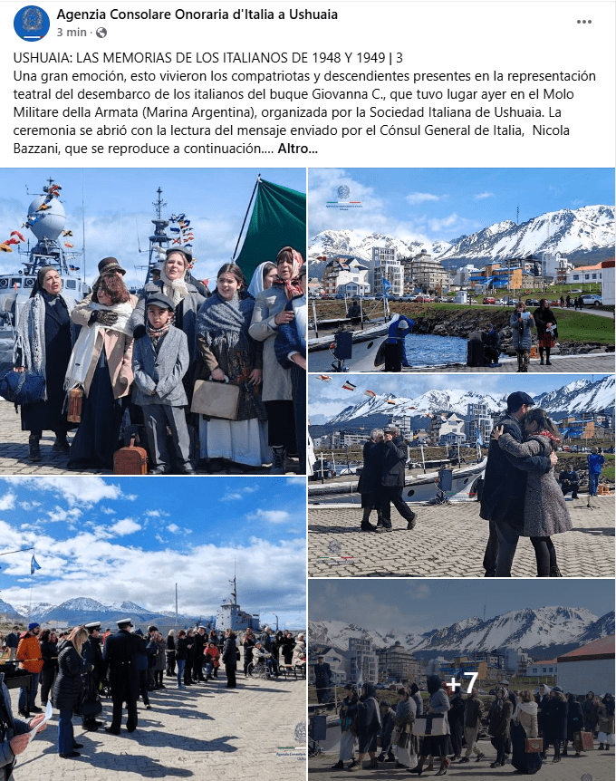 🔴 26 ottobre 2024 | “Las memorias de los italianos de 1948 y 1949“, representación teatral del desembarco de los italianos del buque Giovanna C., que tuvo lugar en el Molo Militare della Armada (Marina Militare Argentina). Facebook link: https://www.facebook.com/agconsolareoditaliaushuaia/posts/pfbid02GvPEmt27wSv2Gw8Pd7RC2frdn3yyXmX4FXorXwKEfo9hAmmsfMCzEhJzT9Rp6DYhl
