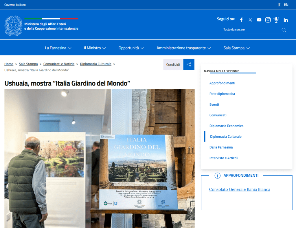 - https://www.esteri.it/it/sala_stampa/archivionotizie/diplomazia-culturale/2025/05/ushuaia-mostra-italia-giardino-del-mondo/