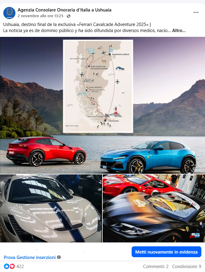 🔴2 de noviembre de 2025: Ushuaia, destino final de la exclusiva «Ferrari Cavalcade Adventure 2025» | Esta Oficina Consular, siguiendo las directrices del Consulado General de Italia en Bahía Blanca, brindó apoyo en el territorio: primero facilitando el contacto con el CEO de la Transbordadora Austral Broom en Chile, y posteriormente colaborando en la organización de la reunión en Ushuaia con las autoridades competentes, con el fin de evaluar y respaldar la iniciativa. Más en: