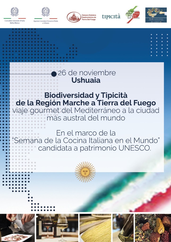 🔴22 de noviembre de 2025 | Un puente entre Italia y Tierra del Fuego, unido por los sabores del Mediterráneo: “Biodiversidad y Tipicidad: desde Le Marche hasta Tierra del Fuego, un viaje de sabores desde el Mediterráneo hasta la ciudad más austral del mundo”.