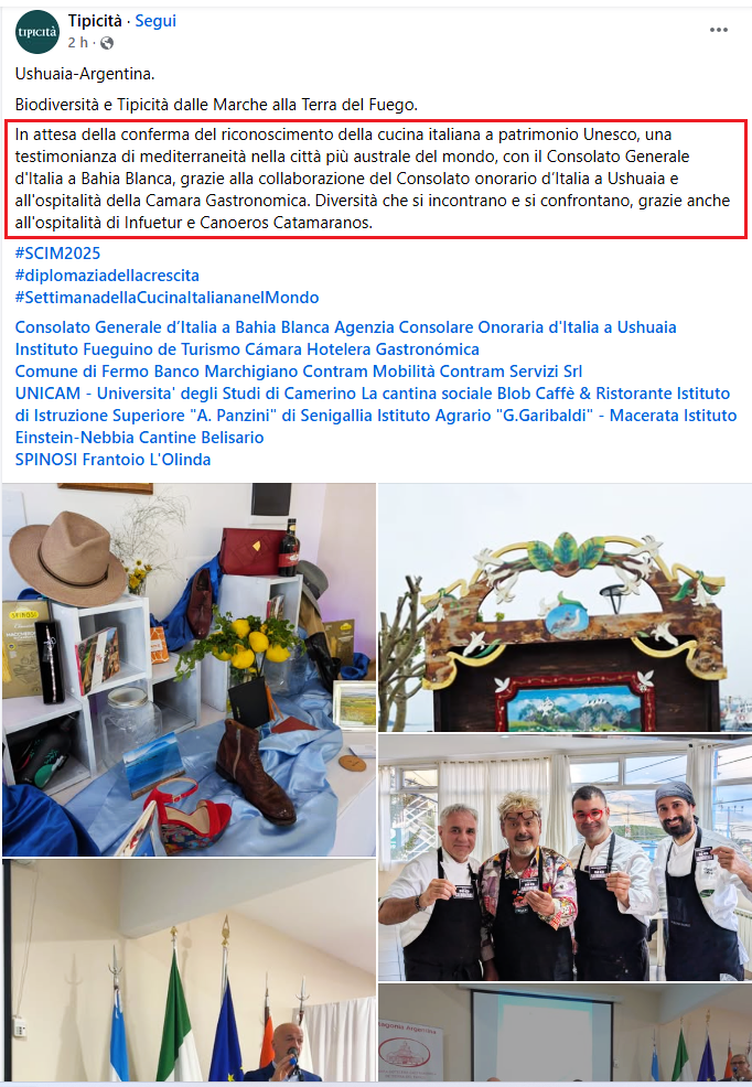 • Evento “Biodiversidad y Tipicidad: desde Le Marche hasta Tierra del Fuego”, en coordinación con el Consulado General de Italia en Bahía Blanca, presentado en la Cámara Hotelera y Gastronómica de Tierra del Fuego, en el marco de la “Settimana della Cucina Italiana nel Mondo”, pocos días antes de que la Cocina Italiana fuera reconocida por la UNESCO como Patrimonio Cultural Inmaterial.