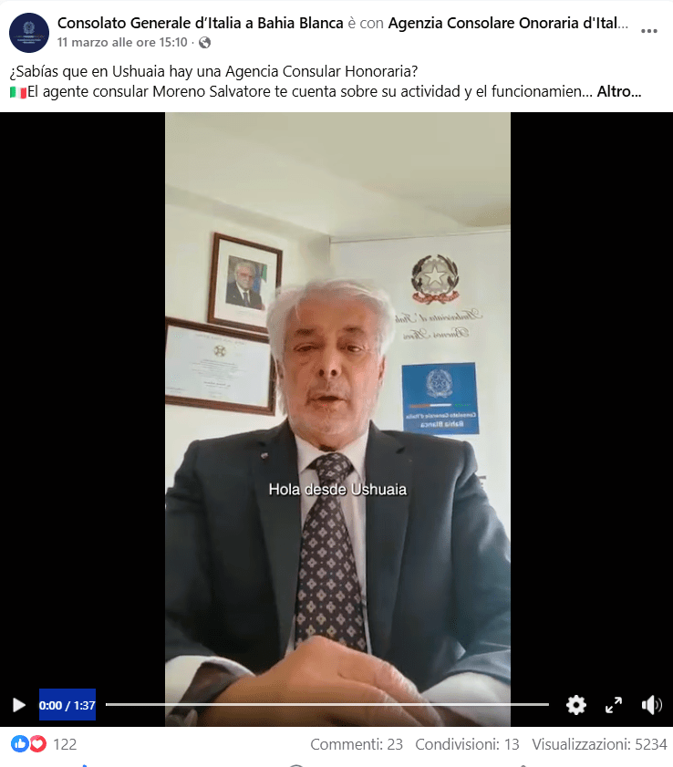 🔵En el ámbito de las redes sociales | La Agencia Consular alcanzó este año más de 2.400 seguidores, sumando Facebook (cuenta activa desde marzo de 2021) e Instagram (@ItalyinUshuaia abierta en fin de 2023). Las cuatro publicaciones con mayor número de visualizaciones en 2025 fueron las dedicadas a: la joven bióloga de la UNTDF ganadora de una beca MAECI, post que ha alcanzado 21.713 visualizaciones ( https://www.facebook.com/agconsolareoditaliaushuaia/posts/pfbid0Ny5EfkUfA3pymUa8F3pENaZQxE2MQEVwYFTq4SZsKCHoDpwrzohFjQPK92fzSGMZl ). La visita del Embajador de Italia Fabrizio Lucentini a Ushuaia, con el evento celebrado en Cerro Castor en el que participaron campeones y campeonas de esquí de la FISI ( https://www.facebook.com/agconsolareoditaliaushuaia/posts/pfbid0Qna5tmC3oJ48a6GAk5uLMjJNzDJ6DqrvLKHJ6KaKYDA65E9z5vpL3457kkKAUfBYl ). La cultura de la legalidad: la promoción del modelo antimafia italiano en Argentina ( https://www.facebook.com/agconsolareoditaliaushuaia/posts/pfbid0e4W5ELS4y4HpSinCyqrhEnLXsVPtJ47XQGwkGgbW1j4vb2KoYUfWN65hVtq1mDHyl ). Y sobre los testimonios de la enorme riqueza artística e identitaria cultural de los descendientes de italianos en América Latina y Norteamérica. ( https://www.facebook.com/agconsolareoditaliaushuaia/posts/pfbid02NpSmxWxJP3Wg1fAagcfp8MeZ1qs8S1rQFTrz1bJWrVTL3jP5sUWjEhQnz4nUXcGPl ).