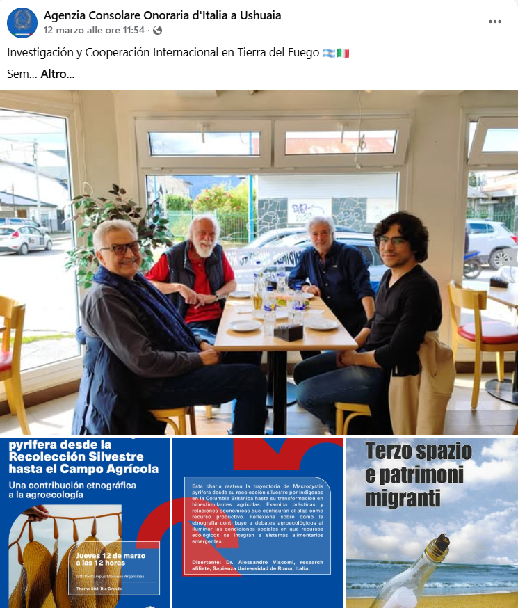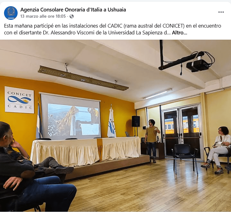 🔴13 de marzo de 2026 | En las instalaciones del CADIC (rama austral del CONICET) en el encuentro con el disertante Dr. Alessandro Viscomi de la Universidad La Sapienza de Roma, acompañado por el Prof. Alessandro Simonicca. Link: https://www.facebook.com/agconsolareoditaliaushuaia/posts/pfbid02PiA1iUpaxtUgvDgApJVEi9PU7Lq53KyREuVjySvGZRLNKvx5TMoPc4wwWRWmk2W9l