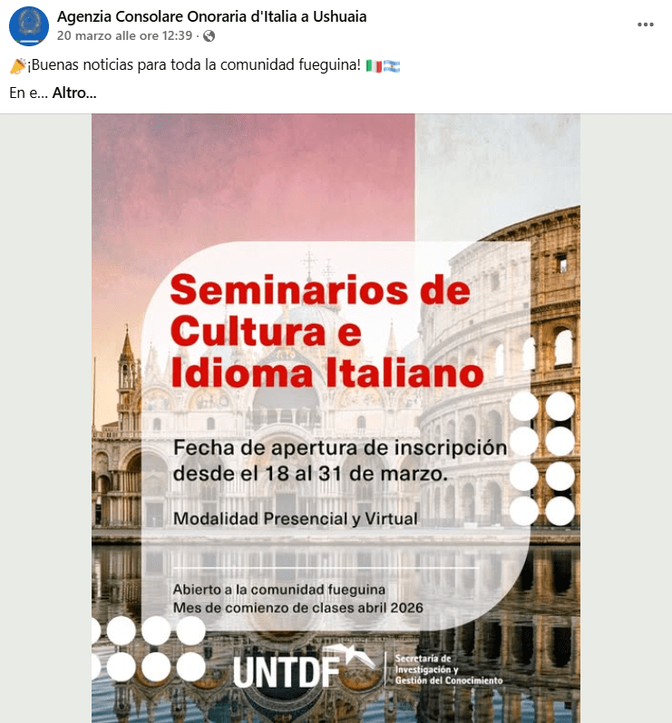 🔴20 de marzo de 2026 | ¡Buenas noticias para toda la comunidad fueguina! La propuesta gratuita, destinada a residentes de toda la provincia, se ofrecerá tanto en modalidad presencial como virtual para garantizar que nadie quede fuera. Link: https://www.facebook.com/agconsolareoditaliaushuaia/posts/pfbid0WZuCo473MgEyV9i68GK6pNWJgtUMgx39xaXDtqhwsZRMoRvTCK8iUsWqYMtZjCScl