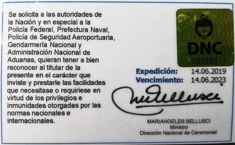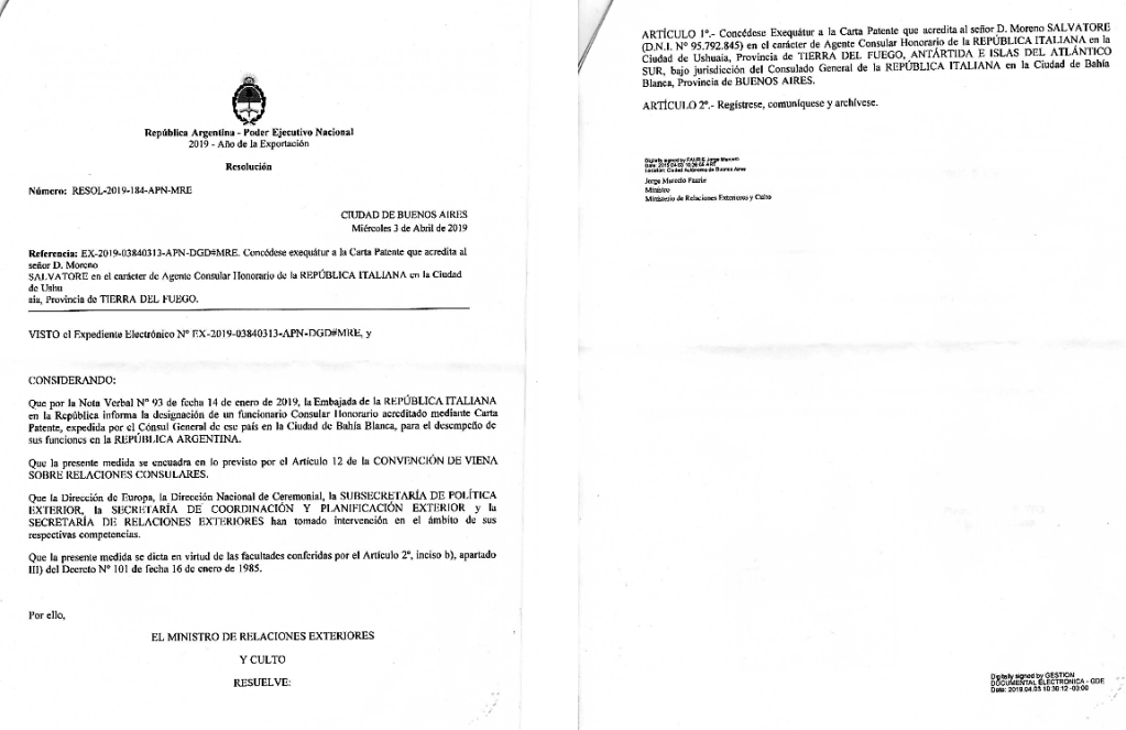 Decreto del Ministero degli Affari Esteri e della Cooperazione Internazionale (18/12/2018) per le funzioni del titolare dell’Agenzia consolare onoraria in Ushuaia ed Exequatur del Ministerio de Relaciones Exteriores y Culto della Repubblica Argentina, link: MORENO-SITO.pdf (esteri.it)