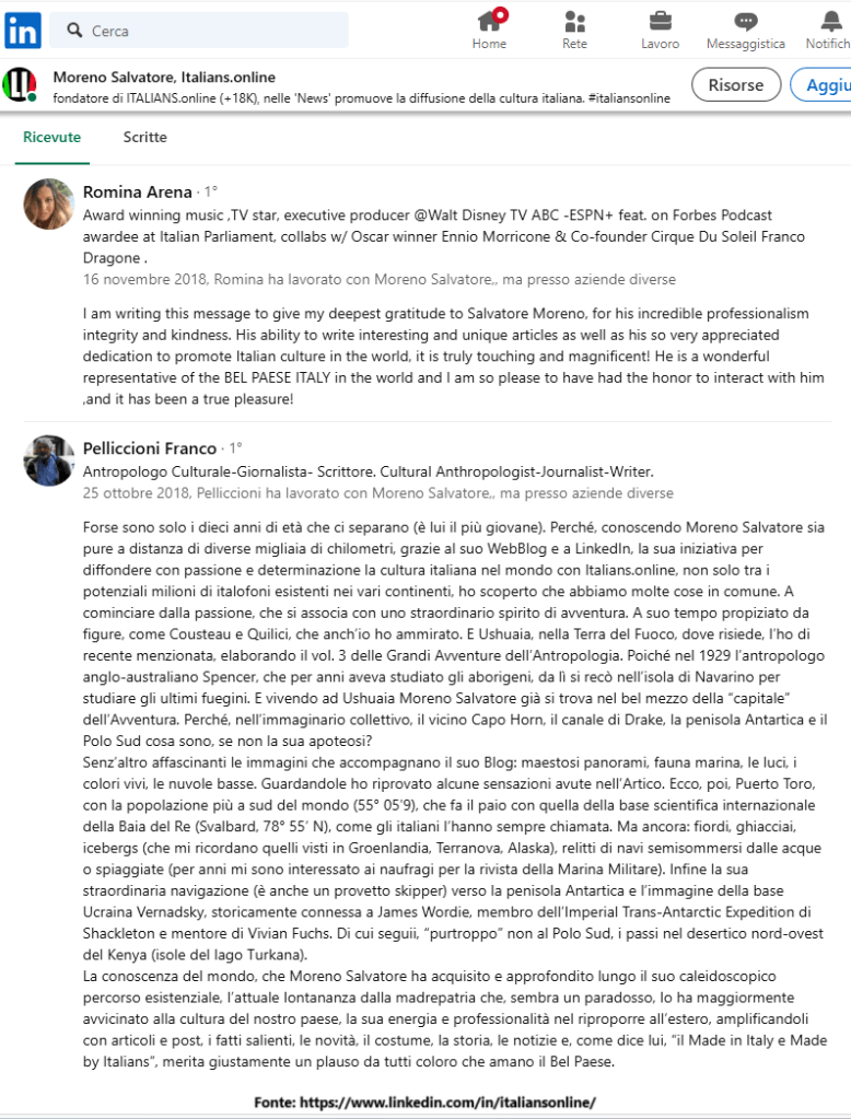 Di seguito, ho creato il WebBlog ITALIANS.online, indirizzato principalmente agli italiani residenti all’estero e agli italo-discendenti, ma anche agli amanti dell’Italian Way of Life. Nel settembre 2018, tra il WebBlog e il social Linkedin, con le news ITALIANS.online ha raggiunto oltre 18.000 connessioni al suo apice, principalmente negli Stati Uniti, Canada, Australia e Argentina. Link dell’intervista su Alpi Fashion Magazine: https://alpifashionmagazine.com/journal/intervista-amoreno-salvatore-italians-online/