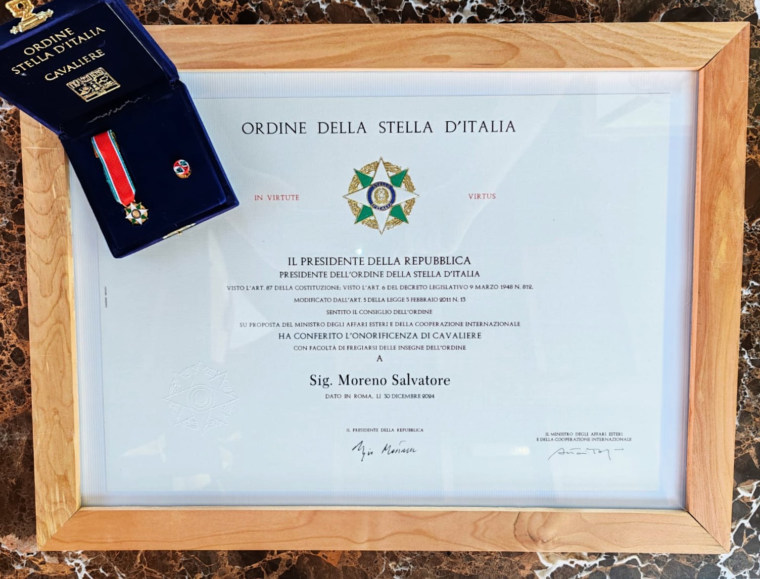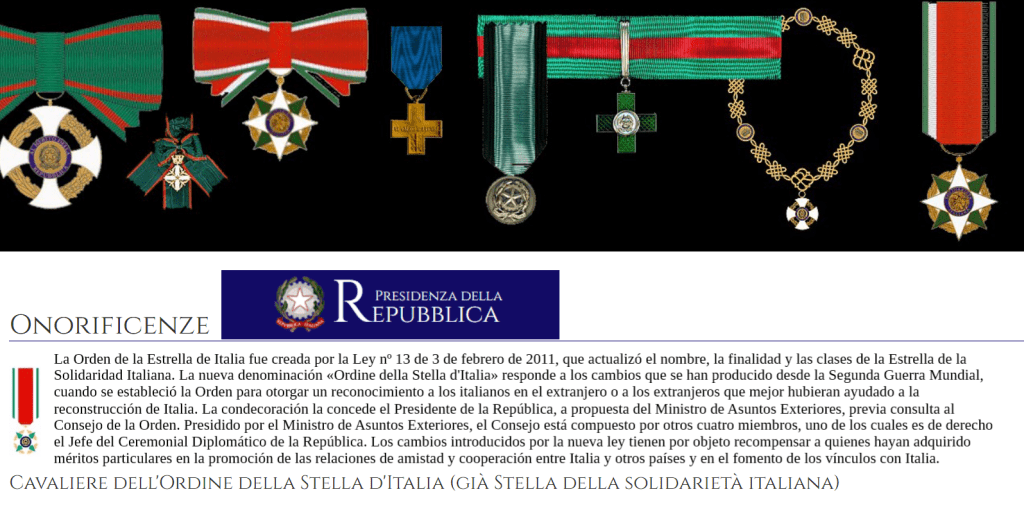 Me siento profundamente honrado de recibir la insignia y el diploma de Cavaliere de la Orden de la Stella d’Italia. Este honor no es simplemente un premio a mi trabajo, es un reconocimiento que me motiva a seguir sirviendo a mi País con compromiso y dedicación.